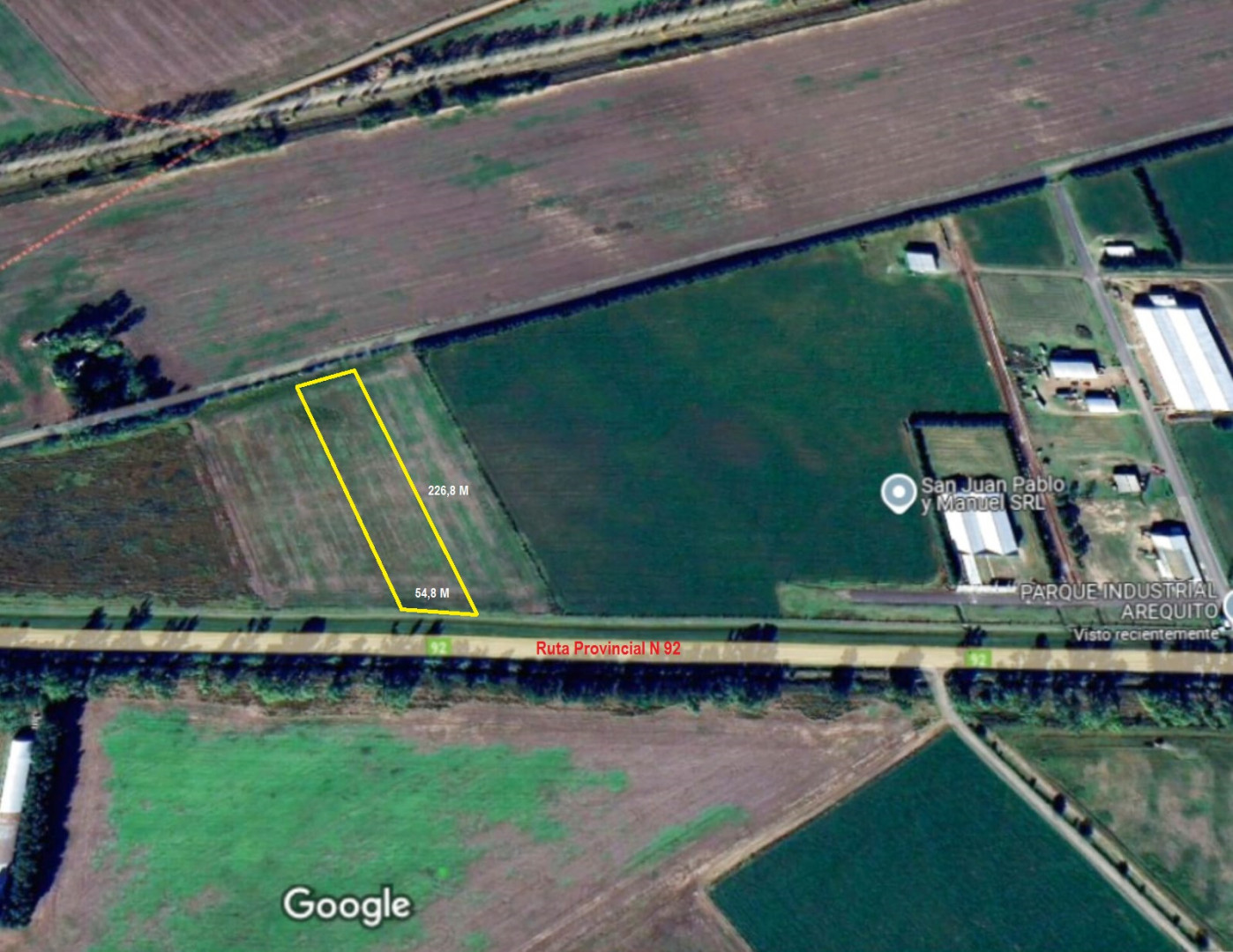 VENTA / ESPECTACULAR TERRENO DE 11.867 M2 ubicado a 1 km de la localidad de la localidad de Arequito, sobre Ruta Provincial N° 92 y próximo al área industria de dicha localidad. El lote cuenta con 54 m de frente a la ruta y 226 metros de largo, no cuenta con linderos construidos. Ideal para galpón agrícola o desarrollo empresarial.